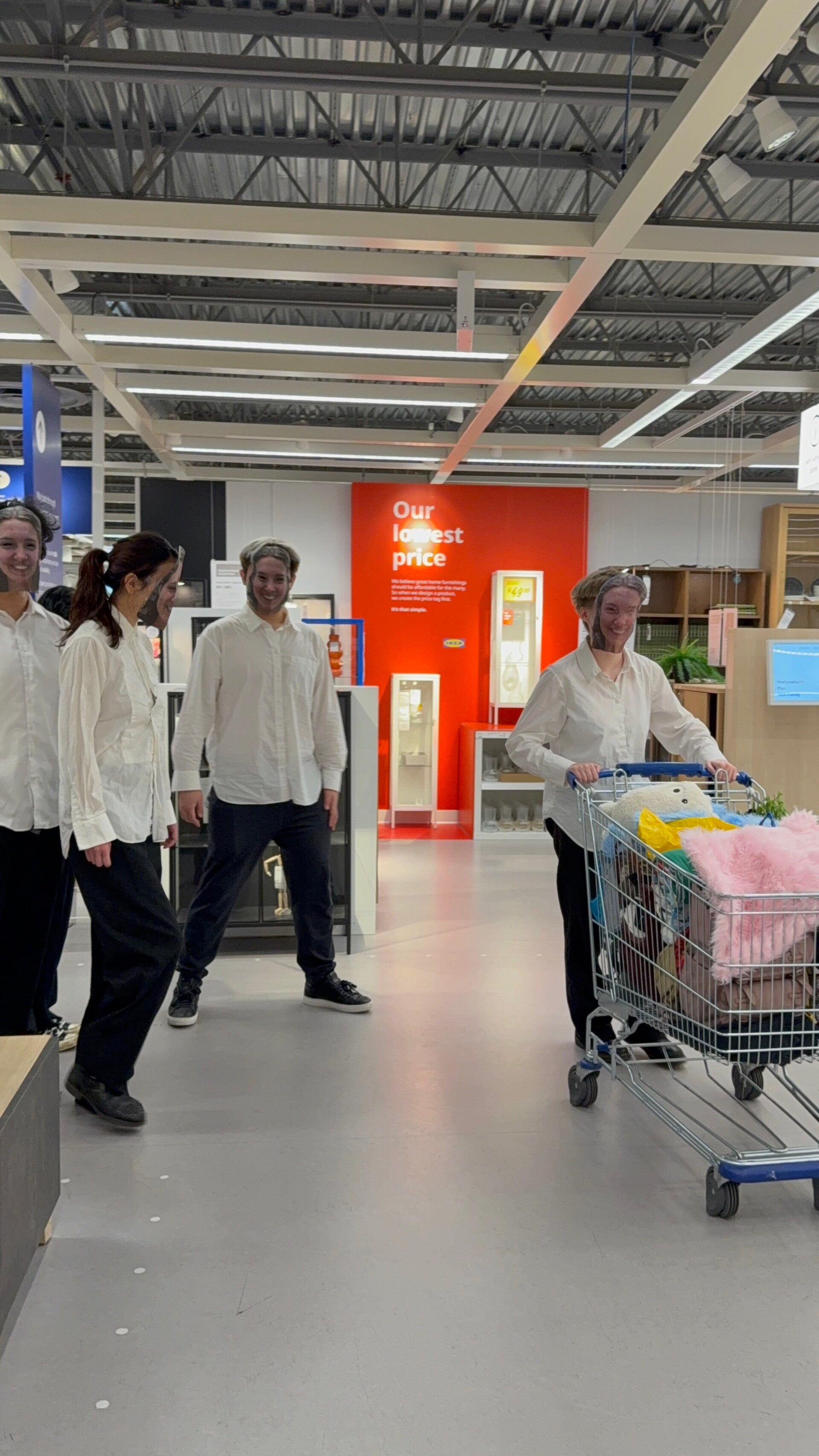 we all wearing the AI generated face masks and formal suits, start in our separate IKEA showrooms making tableaux acting as we totally melting our personae in the environments, Then Ez(Minion’s leader & the one who’s going to shopping) and Raha(Filming & documentary) begin at the top of the escalator.